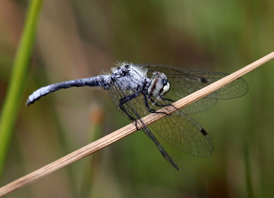 This is the state-endangered Elfin Skimmer, the smallest dragonfly in North America. As always, CLICK THE PIC to see more detail. This is the male, in his chalky-blue finery. Females are just as small, but look totally different. They are wasp mimics, with alternating bands of black and yellowish-white, and even twitch their abdomen like a wasp when at rest. I can about guarantee that we'll see these, and other cool dragonflies on the 13th.